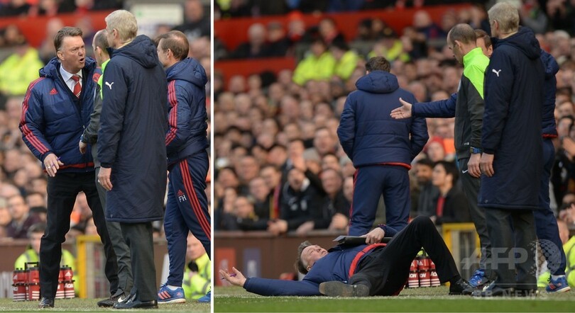 この日、アーセナル(Arsenal)と対戦したユナイテッドだが、試合の中で、アーセナルの選手がダイブ(シミュレーション)したのではないかと考えたファン・ハール監督は、タッチライン際で第4審判のマイク・ディーン(Mike Dean)氏のもとに詰め寄り、背中から地面に倒れて自身の主張を説明した。