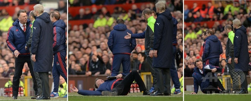この日、アーセナル(Arsenal)と対戦したユナイテッドだが、試合の中で、アーセナルの選手がダイブ(シミュレーション)したのではないかと考えたファン・ハール監督は、タッチライン際で第4審判のマイク・ディーン(Mike Dean)氏のもとに詰め寄り、背中から地面に倒れて自身の主張を説明した。