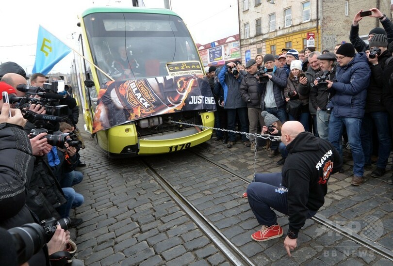 38トンの路面電車を「歯で」引く小児科医、ウクライナ