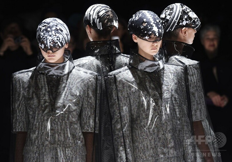 1日には、森永邦彦(Kunihiko Morinaga)が手がける「アンリアレイジ(ANREALAGE)」が新作を発表した。(c)AFP
