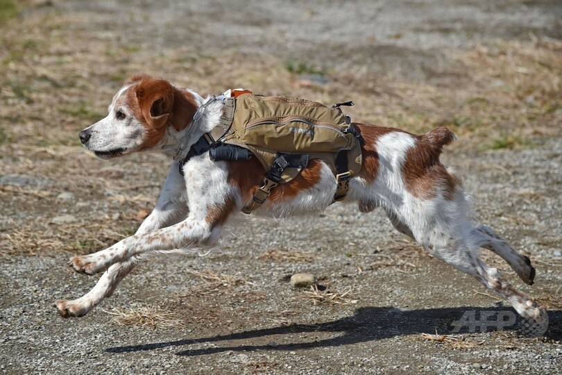 先月、埼玉県富士見市で行われた訓練には、10歳のブリタニー・スパニエルの「ゴンタ」がサイバー救助犬として参加。全地球測位システム(GPS)やカメラなどの計測機器を搭載したバックパック型の装置を背負ってコンクリートのがれきの中を探索し、位置情報や映像をタブレット端末にリアルタイムで送信した。
