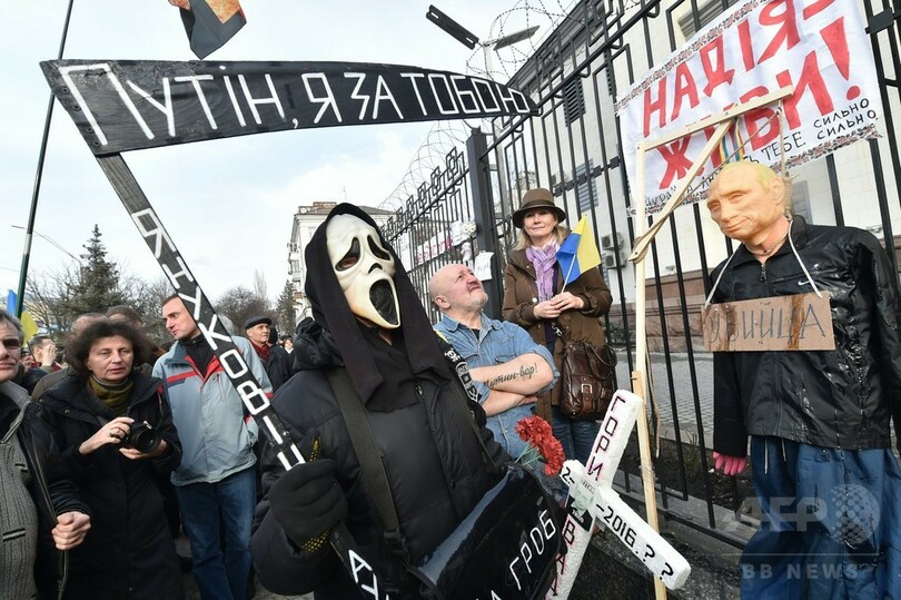 【3月7日 AFP】ウクライナの首都キエフ(Kiev)で6日、ロシア人記者2人を殺害したとしてロシアで裁判にかけられているウクライナ軍パイロットの釈放を求める抗議集会が開かれ、デモ隊の一部がロシア大使館に石や卵を投げつける騒ぎとなった。