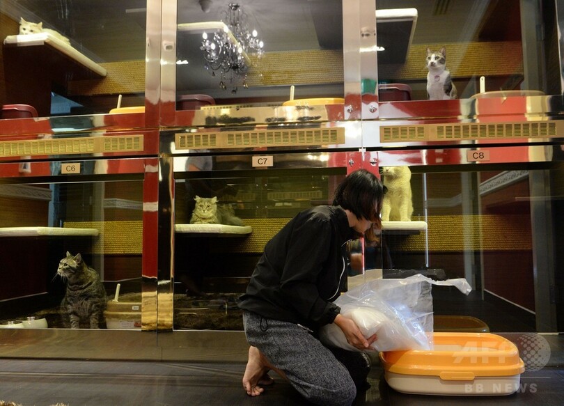 猫用トイレに砂を足す従業員(2016年2月24日撮影)。(c)AFP/ROSLAN RAHMAN