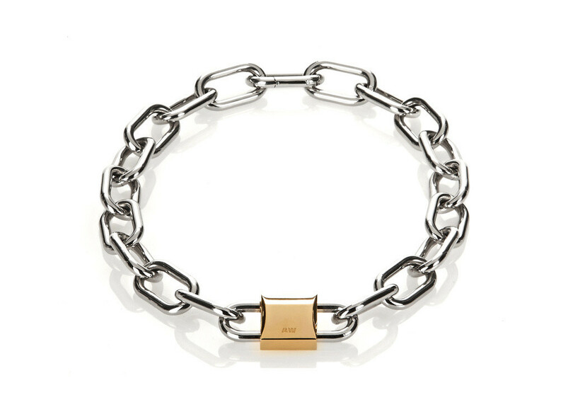 ピアス、カフ、ネックレスの3型からなるジュエリーコレクションは、2016年春夏シーズンのランウェイでモデルが着用していたもの。個性、自己表現、即時性、DIY精神をテーマにしたコレクションと調和するように作られたジュエリーは、工業用のバイクチェーンからインスパイアされた。パラジウム製のラフでハードなスタイルながら、洗練された雰囲気もあわせ持っている。ネックレスとカフのアクセントとなったロック部分は24金コーティングを施した。