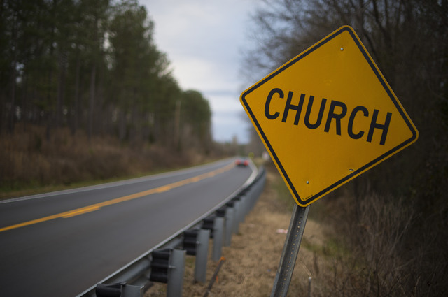 米共和党の大統領候補指名争いでキリスト教福音派の有権者が鍵となることが予想されるサウスカロライナ州で、アンダーソン付近に立つ「教会」の道路標識(2016年2月16日撮影)。(c)AFP/JIM WATSON