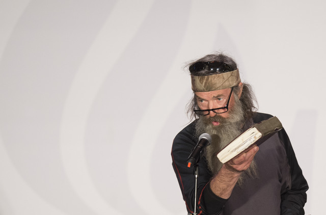 米共和党の大統領候補指名争い、サウスカロライナ州チャールストンで開かれたテッド・クルーズ候補の集会で、聖書を手に応援演説を行うリアリティー番組スターのフィル・ロバートソン氏(2016年2月19日撮影)。(c)AFP/JIM WATSON