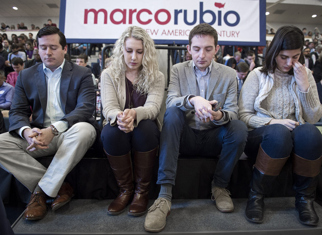 米共和党の大統領候補指名争い、バージニア州パーセルビルで開かれたマルコ・ルビオ候補の集会で祈りをささげる支持者たち(2016年2月28日撮影)。(c)AFP/PAUL J. RICHARDS