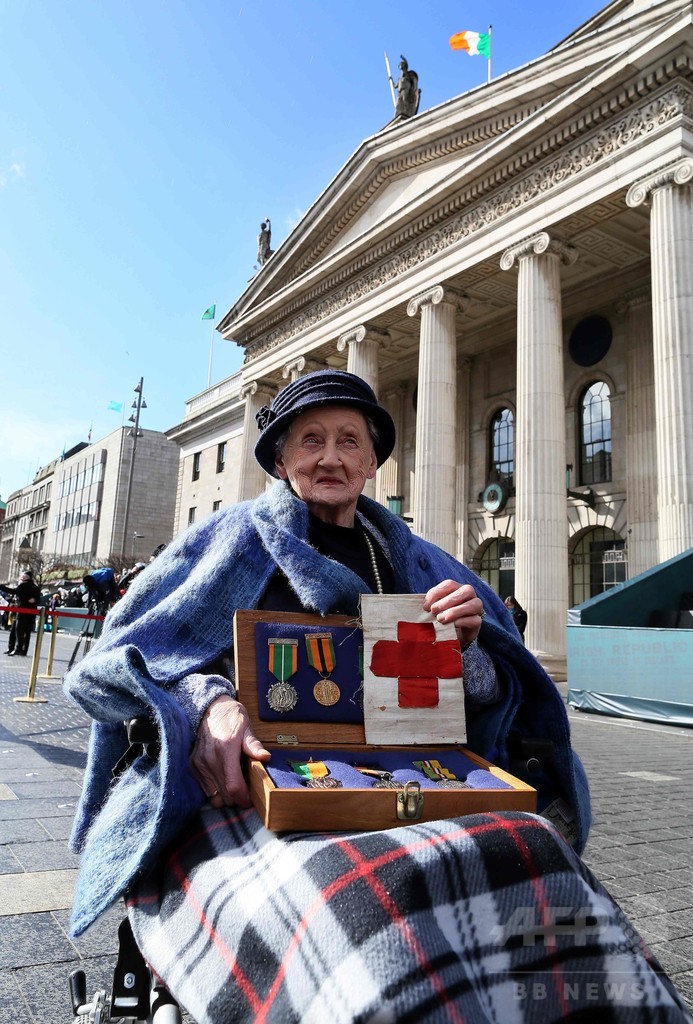 イースター蜂起は1916年4月24日、イースター(復活祭)明けの月曜日に英国支配からの独立を目指すアイルランド人1000人超が武装蜂起し、ダブリン中心部の建物を占拠したもの。英国は軍の増援を派遣してダブリン市内に砲撃を加え、激しい戦闘の末、29日に蜂起軍が投降し、蜂起は6日間で鎮圧された。多くの市民は当初、蜂起に批判的だったが、その後の取り締まりで数千人が逮捕されたことから英国に対する怒りが広がり、独立の機運が高まることとなった。(c)AFP/Declan Carty