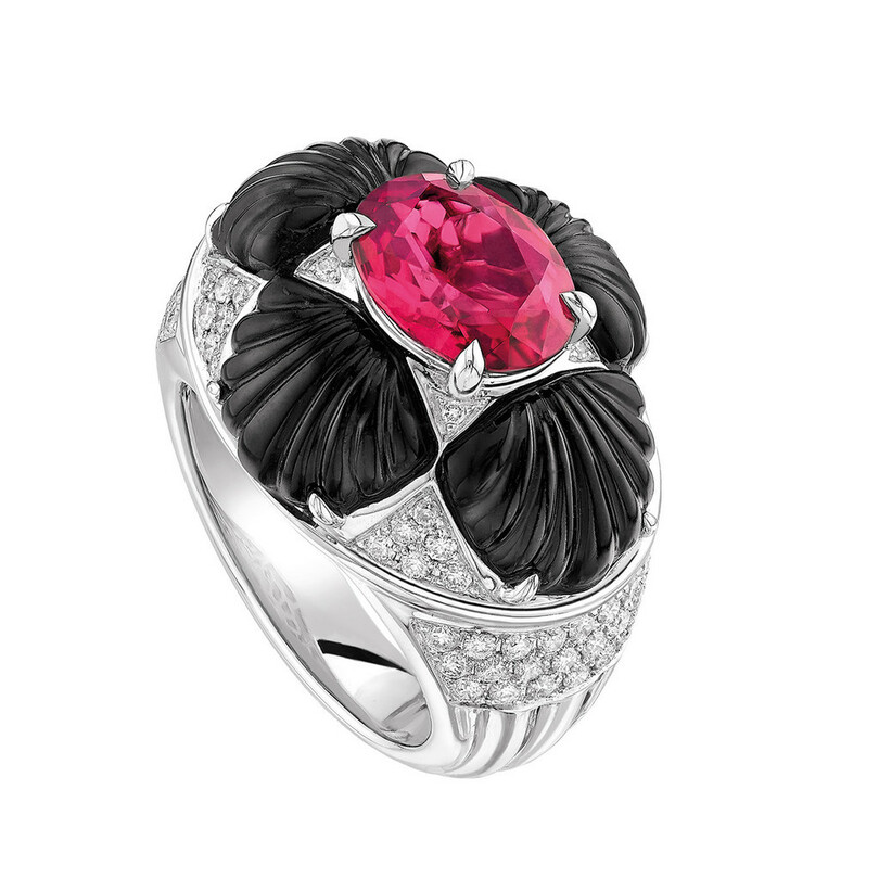 サラが演じた悲劇の女優アドリエンヌに捧げる「アドリエンヌ」には、ルネとオペラ座ガルニエ宮のコラボレーションジュエリーが登場。オペラ座の赤い緞帳をイメージしたルベライトにダイヤモンドとオニキスをそえたリングが、中心的な存在として輝きを放つ。また「シークレットガーデン」では、ダイヤモンドやオニキスで“リス(百合)”モチーフを、パール、ホワイトゴールド、パヴェダイヤモンドでメゾンの象徴“ミュゲ(すずらん)”を表現した。