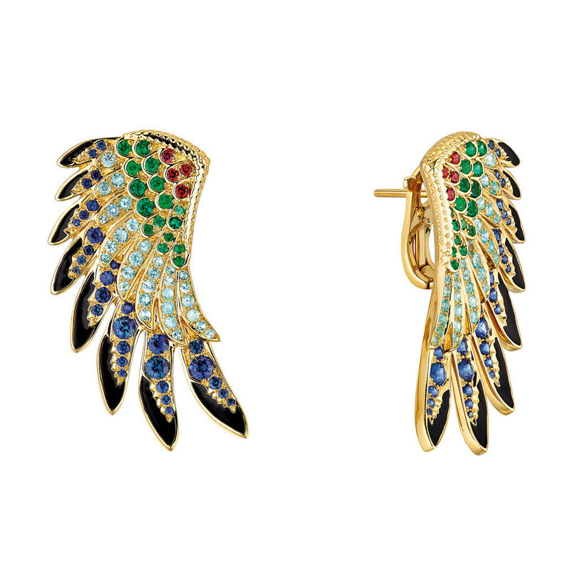 「アニマル」には、イエローゴールド、エメラルド、サファイア、トルマリンで鮮やかに描き出した“ぺロケ(オウム)”や、サラがペットとして肩に乗せていたという“スカラベ(黄金虫)”モチーフのジュエリーがお目見え。「ヴェスタ」はホワイトゴールド、ブラックダイヤモンド、ブラックスピネル、マザーオブパールを使った神話の美の象徴である女神をモチーフとしたペンダント、リング、イヤリングをラインナップする。