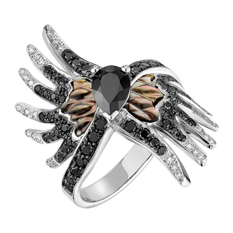 「アニマル」には、イエローゴールド、エメラルド、サファイア、トルマリンで鮮やかに描き出した“ぺロケ(オウム)”や、サラがペットとして肩に乗せていたという“スカラベ(黄金虫)”モチーフのジュエリーがお目見え。「ヴェスタ」はホワイトゴールド、ブラックダイヤモンド、ブラックスピネル、マザーオブパールを使った神話の美の象徴である女神をモチーフとしたペンダント、リング、イヤリングをラインナップする。