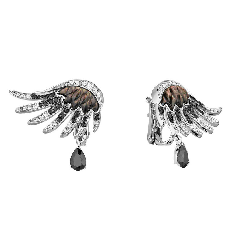 「アニマル」には、イエローゴールド、エメラルド、サファイア、トルマリンで鮮やかに描き出した“ぺロケ(オウム)”や、サラがペットとして肩に乗せていたという“スカラベ(黄金虫)”モチーフのジュエリーがお目見え。「ヴェスタ」はホワイトゴールド、ブラックダイヤモンド、ブラックスピネル、マザーオブパールを使った神話の美の象徴である女神をモチーフとしたペンダント、リング、イヤリングをラインナップする。