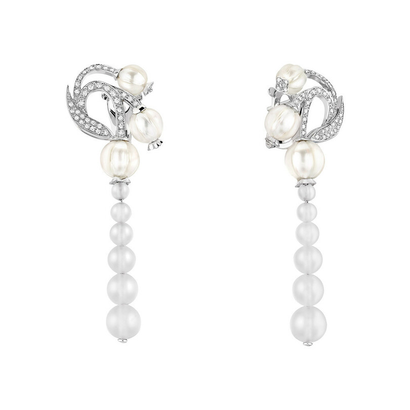 サラが演じた悲劇の女優アドリエンヌに捧げる「アドリエンヌ」には、ルネとオペラ座ガルニエ宮のコラボレーションジュエリーが登場。オペラ座の赤い緞帳をイメージしたルベライトにダイヤモンドとオニキスをそえたリングが、中心的な存在として輝きを放つ。また「シークレットガーデン」では、ダイヤモンドやオニキスで“リス(百合)”モチーフを、パール、ホワイトゴールド、パヴェダイヤモンドでメゾンの象徴“ミュゲ(すずらん)”を表現した。