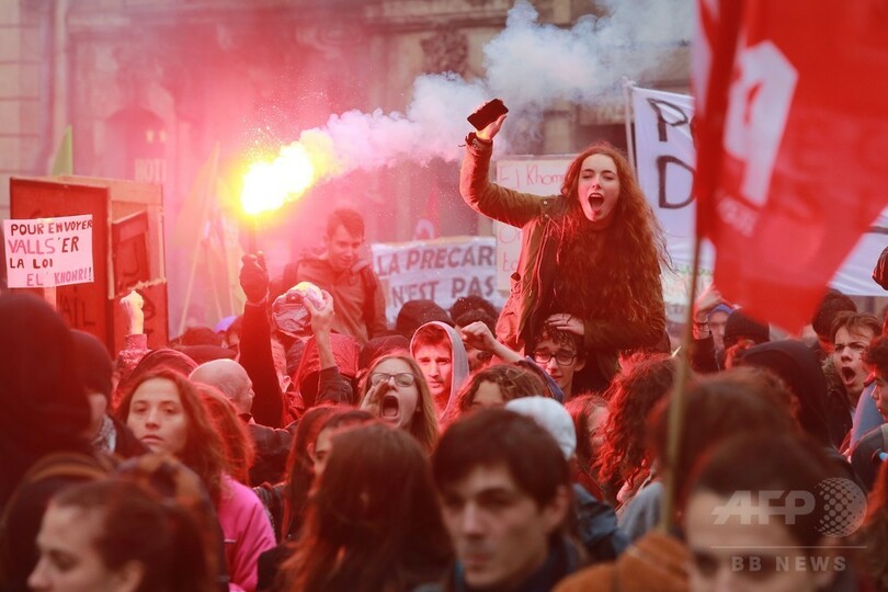 デモは仏全土の200か所で行われる見通しとなっている。西部ナント(Nantes)とレンヌ(Rennes)では機動隊とデモ隊が衝突した。またパリでは「よりよい(法案を)求める」「19世紀への大躍進」などと書かれた横断幕を掲げてデモ隊が行進。警察当局によると、パリではデモの参加者ら10人が拘束された。