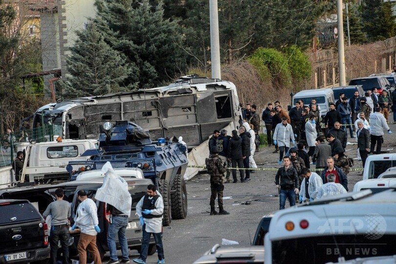 【4月1日 AFP】トルコ南東部ディヤルバクル(Diyarbakir)で3月31日、警察車両を狙った爆弾攻撃があり、警官7人が死亡、少なくとも27人が負傷した。非合法のクルド人反政府武装組織「クルド労働者党(PKK)」の犯行が疑われており、レジェプ・タイップ・エルドアン(Recep Tayyip Erdogan)大統領は、事件は「テロリストの真の顔」を世界に示すものとなるはずだと述べている。