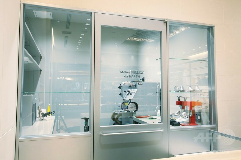 商品には、履き口のホールカットがアクセントとなるアイコンパンプス「アネッリ」の豊富なバリエーションや、シーズンアイテム、同店限定アイテムなど、「ペリーコ」コレクションを一堂にラインナップした。またリペアサービスを行うアトリエも併設し、ガラス越しに職人の丁寧な手仕事を見ることができる。
