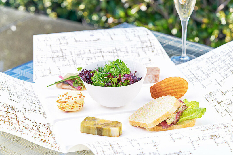 中でも1日30箱限定「GINZA Box」は、軽食とデザートを盛り込んだセットとして人気のメニュー。野菜のテリーヌ、ビーフサンドイッチ、サラダ、マリネ、テリーヌ・カンパーニュ、バニラ風味のマドレーヌとレモンとヘーゼルナッツのマカロンなどを、環境にやさしく美しい紙の器、WASARAによるシャンパンゴールドのツイード柄オリジナルボックスに詰め込んだ。これにグラスシャンパーニュがついたセットも用意する。なお4月中は、マカロンを桜風味に、セットのシャンパーニュをロゼに替えた「GINZA Sakura Box」で、春らしさを満喫して。