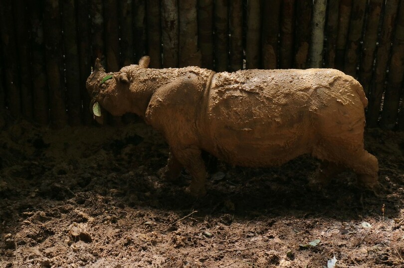 この雌のスマトラサイは先月、東カリマンタン(East Kalimantan)州にある鉱山とプランテーションに近い場所で落とし穴に転落しているのが見つかった。環境保護活動家がカリマンタン島のスマトラサイに接触したのは実に四十数年ぶりだった。