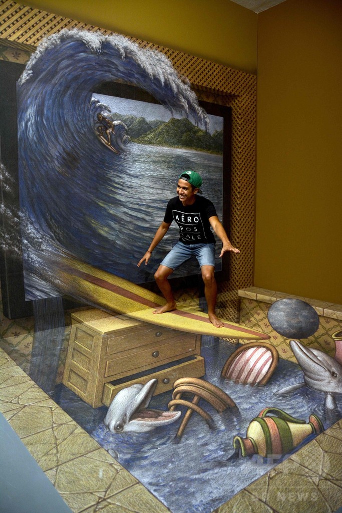 【4月8日 AFP】メキシコのプラヤ・デル・カルメン(Playa del Carmen)にある3Dトリックアート美術館「3D ミュージアム・オブ・ワンダー(3D Museum of Wonder)」で、米国のトリックアート作家カート・ウェナー(Kurt Wenner)さんの作品が展示されている。来場者はあたかも絵に描かれた場面に遭遇しているかのようなポーズを取り、作品を楽しんだ。