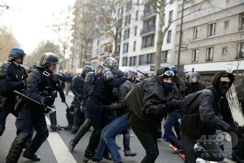 社会党政権による労働法改正案は、経営難に陥った企業が従業員の解雇をしやすくする内容。時に暴力的になりながら数週間に及んでいる抗議行動を率先しているのは学生たちだ。フランスでは若年層の失業率が25%に達し、政府は失業率の改善を目標にしているが、改正案では目標達成は困難との見方が強い。(c)AFP/Gina DOGGETT
