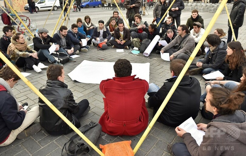 各都市の中央広場などに集まり、警官隊に解散させられる明け方まで夜通しで広場を占拠するという抗議行動で、パリ(Paris)では3月31日以降、大勢の人々が毎晩レピュブリック広場(Place de la Republique)に集まっている。