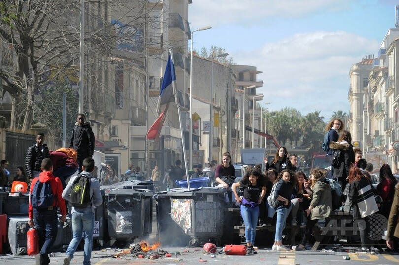 社会党政権による労働法改正案は、経営難に陥った企業が従業員の解雇をしやすくする内容。時に暴力的になりながら数週間に及んでいる抗議行動を率先しているのは学生たちだ。フランスでは若年層の失業率が25%に達し、政府は失業率の改善を目標にしているが、改正案では目標達成は困難との見方が強い。(c)AFP/Gina DOGGETT