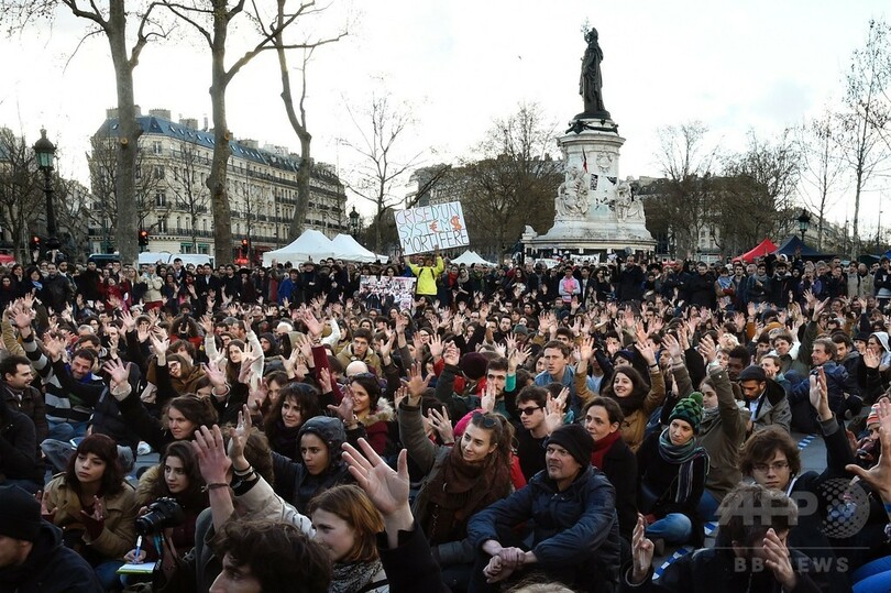 各都市の中央広場などに集まり、警官隊に解散させられる明け方まで夜通しで広場を占拠するという抗議行動で、パリ(Paris)では3月31日以降、大勢の人々が毎晩レピュブリック広場(Place de la Republique)に集まっている。