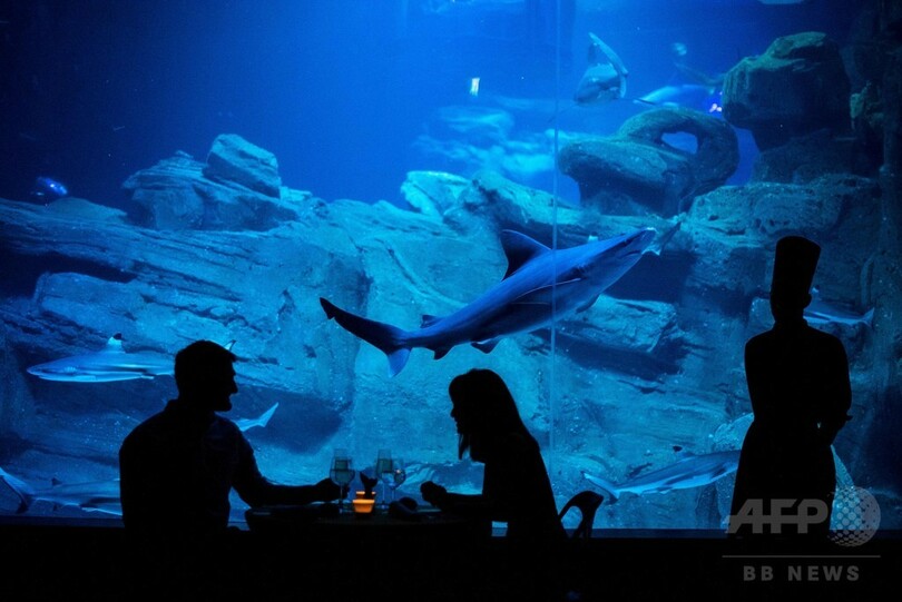 民泊仲介サービス「エアビーアンドビー(Airbnb)」のキャンペーンとして行われたもので、この日の宿泊者には英国のアリスター・シップマン(Alister Shipman)さんとハンナ・シンプソン(Hannah Simpson)さんが選ばれた。2人はサメたちに囲まれて一夜を過ごした。(c)AFP