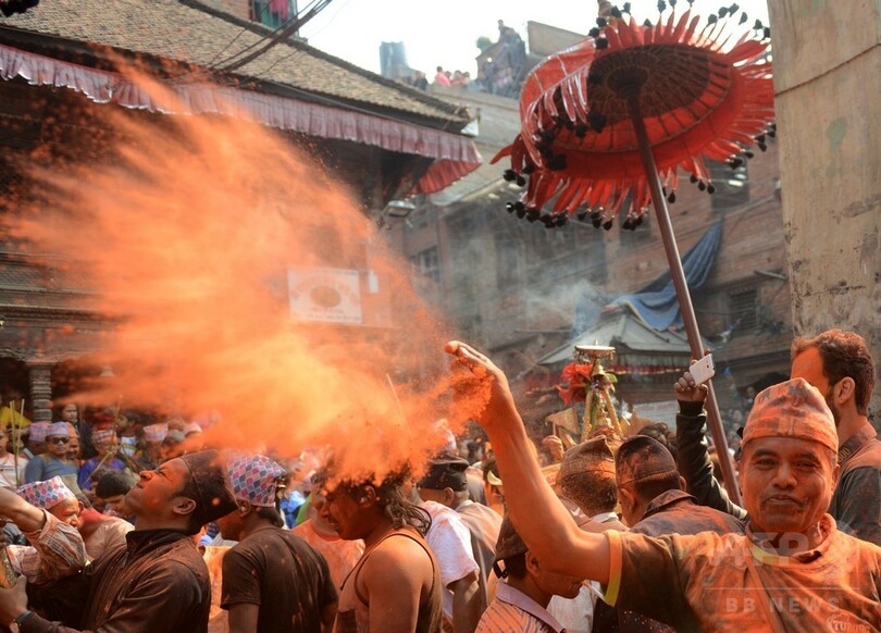 【4月15日 AFP】ネパールの首都カトマンズ(Kathmandu)近郊の町ティミ(Thimi)で14日、伝統行事「ビスケット・ジャトラ(Bisket Jatra)」祭が行われた。14日は同国の暦で新年に当たる。人々は、朱色の粉を全身に塗りつけ歌い踊りながら、新年を祝った。(c)AFP