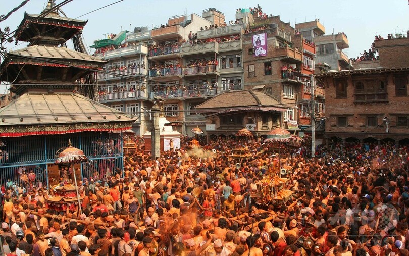 朱に染まる新年祝賀祭、ネパールの首都近郊