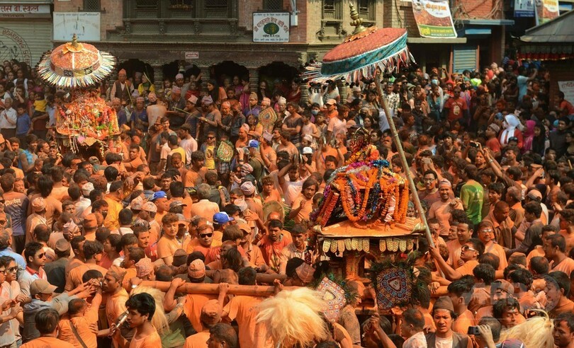 朱に染まる新年祝賀祭、ネパールの首都近郊