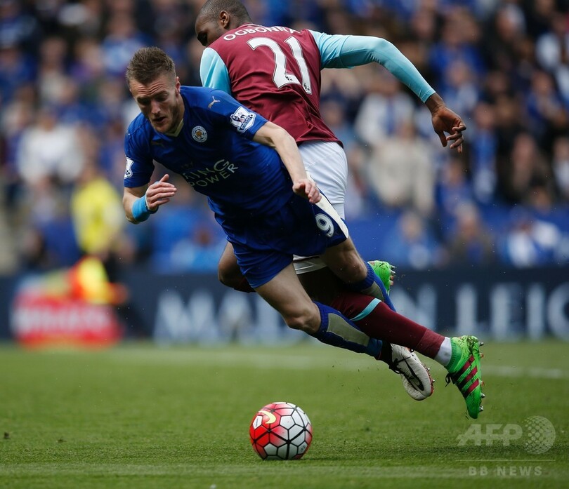 【4月18日 AFP】15-16イングランド・プレミアリーグは17日、第34節の試合が行われ、首位レスター・シティ(Leicester City)はエースのジェイミー・バーディー(Jamie Vardy)が物議を醸す判定で退場処分になりながらも、ウェストハム(West Ham)と2-2で引き分けた。