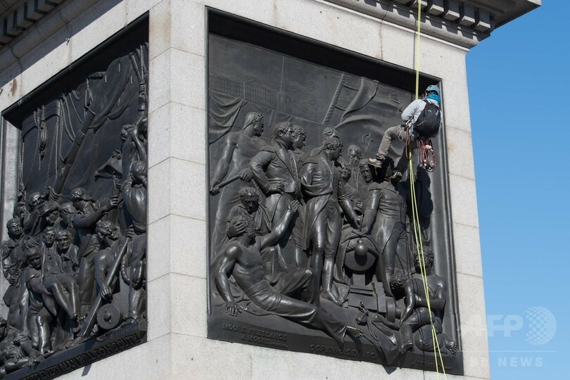 トラファルガー広場(Trafalgar Square)では同日、同団体の活動家2人が、高さ52メートルのネルソン提督(Admiral Horatio Nelson)像によじ登り、口部分にガスマスクをかぶせた。