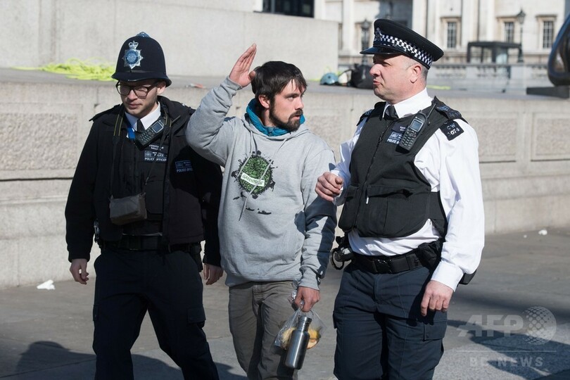 トラファルガー広場(Trafalgar Square)では同日、同団体の活動家2人が、高さ52メートルのネルソン提督(Admiral Horatio Nelson)像によじ登り、口部分にガスマスクをかぶせた。