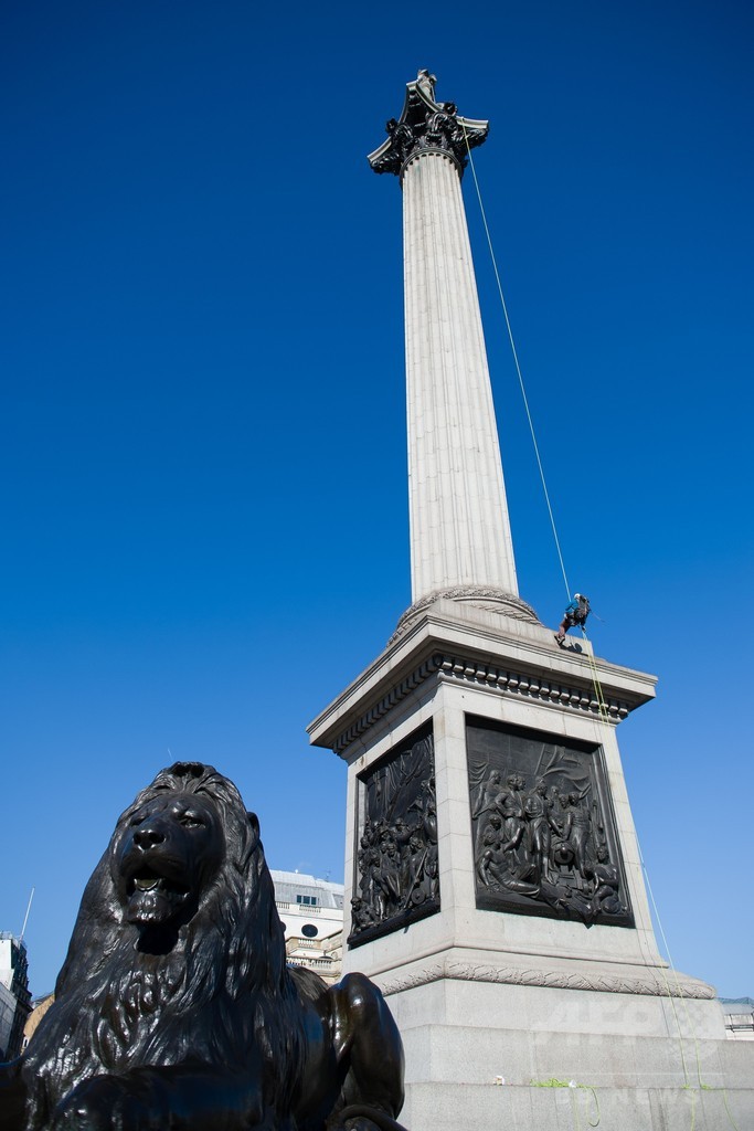 トラファルガー広場(Trafalgar Square)では同日、同団体の活動家2人が、高さ52メートルのネルソン提督(Admiral Horatio Nelson)像によじ登り、口部分にガスマスクをかぶせた。