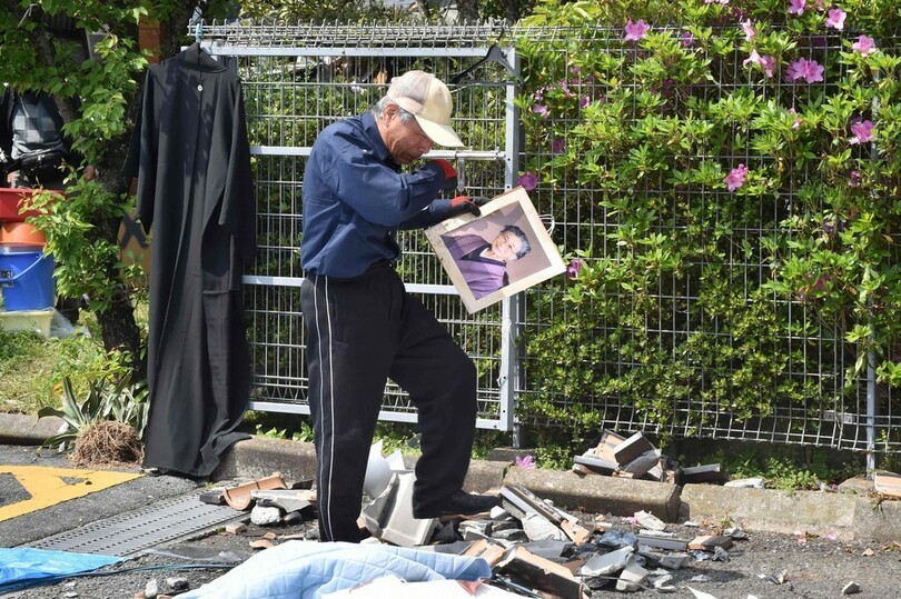 19日、消防隊が町内を調査するかたわらで、倒壊した自宅から家族の遺影を見つけ出し涙する住民の姿があった。