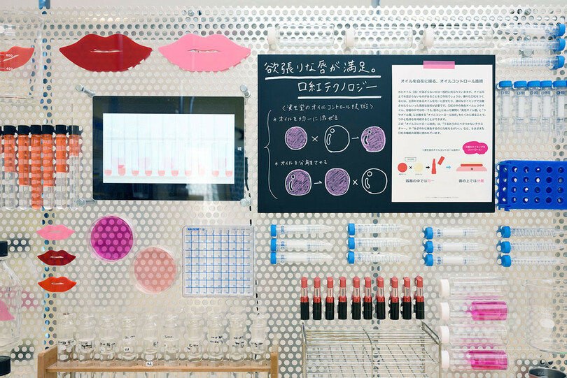本ラボは、資生堂の技術を映像で分かりやすく紹介するサイト「PICK UP TECHNOLOGY」の映像コンテンツと、資生堂研究室で実際に使われている実験アイテムを通して、科学の世界を五感で堪能できる企画展。落ちない口紅の仕掛け、光をあやつるファンデーションの秘密、平安時代の香りを復元する技術など、美と科学のイマジネーションあふれる化粧品の世界を楽しく解き明かしていく。
