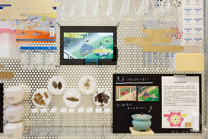 本ラボは、資生堂の技術を映像で分かりやすく紹介するサイト「PICK UP TECHNOLOGY」の映像コンテンツと、資生堂研究室で実際に使われている実験アイテムを通して、科学の世界を五感で堪能できる企画展。落ちない口紅の仕掛け、光をあやつるファンデーションの秘密、平安時代の香りを復元する技術など、美と科学のイマジネーションあふれる化粧品の世界を楽しく解き明かしていく。