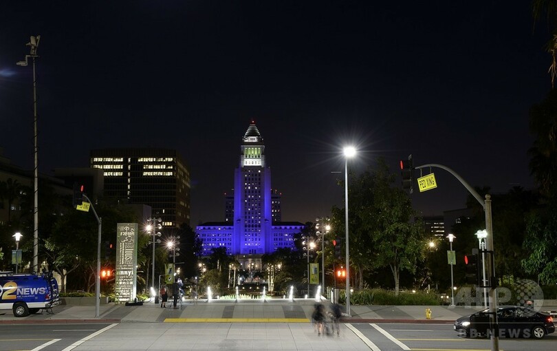 ロサンゼルス(Los Angeles)では市庁舎が、豪メルボルンではビクトリア・アート・センター(Victoria Arts Centre)が、プリンスさんを追悼するため、紫色にライトアップされた。(c)AFP