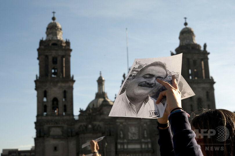 【4月28日 AFP】メキシコの首都メキシコ市(Mexico City)のソカロ広場(Zocalo Square)で27日、新聞社の創業者で編集者のフランシスコ・パチェコ(Francisco Pacheco)氏が殺害された事件を受け、同僚やフォトジャーナリストたちが大聖堂前にパチェコ氏の写真を並べて抗議活動を行った。
