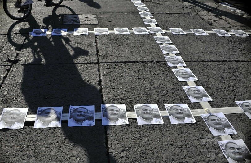 【4月28日 AFP】メキシコの首都メキシコ市(Mexico City)のソカロ広場(Zocalo Square)で27日、新聞社の創業者で編集者のフランシスコ・パチェコ(Francisco Pacheco)氏が殺害された事件を受け、同僚やフォトジャーナリストたちが大聖堂前にパチェコ氏の写真を並べて抗議活動を行った。