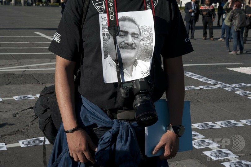 【4月28日 AFP】メキシコの首都メキシコ市(Mexico City)のソカロ広場(Zocalo Square)で27日、新聞社の創業者で編集者のフランシスコ・パチェコ(Francisco Pacheco)氏が殺害された事件を受け、同僚やフォトジャーナリストたちが大聖堂前にパチェコ氏の写真を並べて抗議活動を行った。