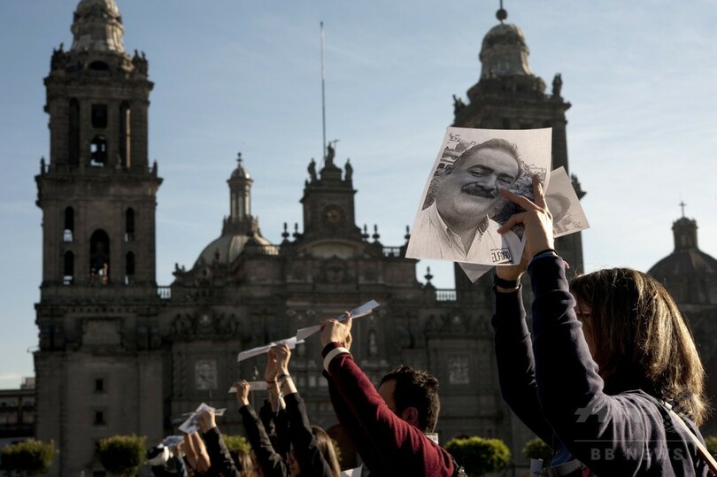 【4月28日 AFP】メキシコの首都メキシコ市(Mexico City)のソカロ広場(Zocalo Square)で27日、新聞社の創業者で編集者のフランシスコ・パチェコ(Francisco Pacheco)氏が殺害された事件を受け、同僚やフォトジャーナリストたちが大聖堂前にパチェコ氏の写真を並べて抗議活動を行った。