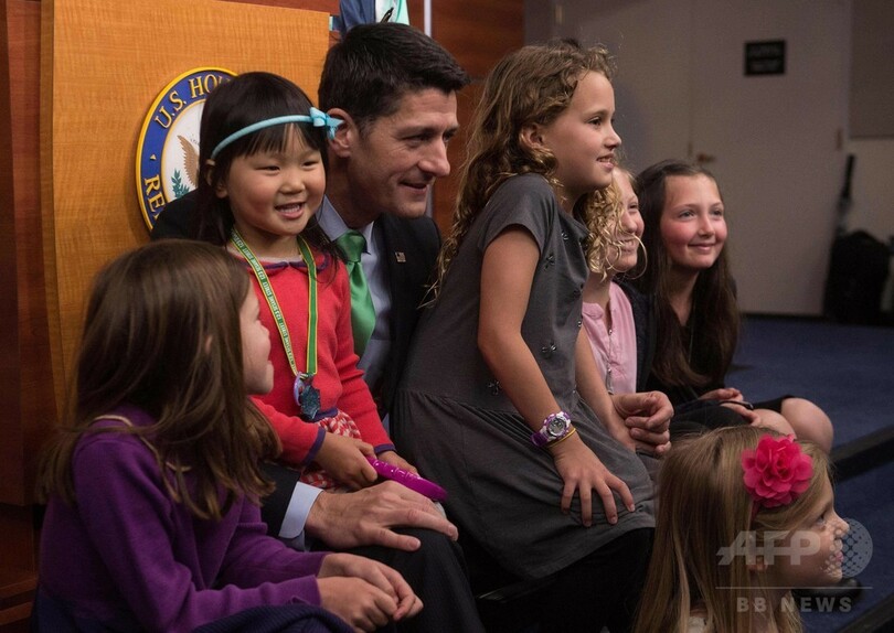 また同日は、ポール・ライアン(Paul Ryan)下院議長も、ワシントンで開かれた定例会見の後、記者たちの子どもたちとなごやかに記念撮影に応じる場面も見られた。(c)AFP