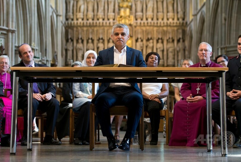 【5月8日 AFP】英首都ロンドン(London)で7日、野党・労働党からロンドン市長選に出馬し、イスラム教徒として初めて欧米の主な首都の市長に当選したサディク・カーン(Sadiq Khan)氏(45)の就任宣誓式が行われた。