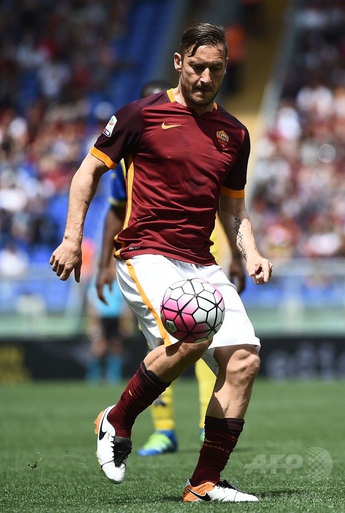 39歳のトッティは、ACミラン(AC Milan)のパオロ・マルディーニ(Paolo Maldini、647試合)、インテル(Inter Milan)のハビエル・サネッティ(Javier Zanetti、615試合)に続き、セリエA通算出場数で歴代3位につけている。(c)AFP