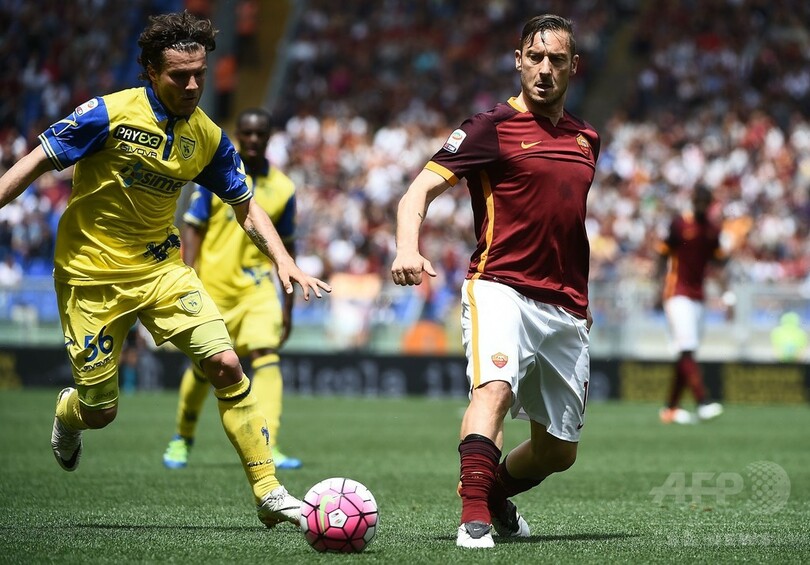 39歳のトッティは、ACミラン(AC Milan)のパオロ・マルディーニ(Paolo Maldini、647試合)、インテル(Inter Milan)のハビエル・サネッティ(Javier Zanetti、615試合)に続き、セリエA通算出場数で歴代3位につけている。(c)AFP