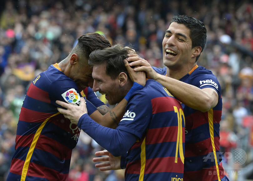 【5月9日 AFP】15-16スペイン1部リーグは8日、第37節の試合が行われ、リオネル・メッシ(Lionel Messi)、ルイス・スアレス(Luis Suarez)、ネイマール(Neymar da Silva Santos Junior)がそろって得点したFCバルセロナ(FC Barcelona)は、RCDエスパニョール(RCD Espanyol)とのダービーを5-0で制し、優勝に王手をかけた。