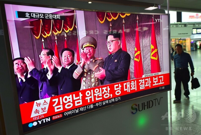 【5月10日 AFP】北朝鮮・平壌(Pyongyang)の金日成広場(Kim Il-Sung Square)で10日、朝鮮労働党大会の閉幕を記念し、大規模な祝賀パレードが行われた。人民大学習堂(Grand People's Study House)のバルコニーから手を振る最高指導者の金正恩(キム・ジョンウン、Kim Jong-Un)氏の姿もみられた。