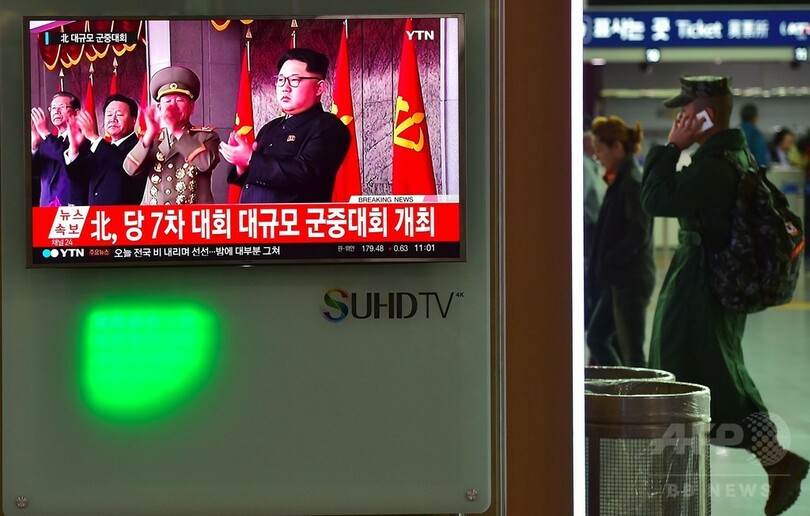 【5月10日 AFP】北朝鮮・平壌(Pyongyang)の金日成広場(Kim Il-Sung Square)で10日、朝鮮労働党大会の閉幕を記念し、大規模な祝賀パレードが行われた。人民大学習堂(Grand People's Study House)のバルコニーから手を振る最高指導者の金正恩(キム・ジョンウン、Kim Jong-Un)氏の姿もみられた。